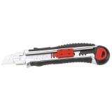 Celokovový ulamovací nůž s kovovou vodící lištou a pryžovým pláštěm. Ocelové vodítko čepele sevždy automaticky uzamkne proti pohybu a umožňuje rychlou výměnu náhradní čepele přímo zezásobníku. Šroubová aretace na zadní straně k ještě pevnější aretaci čepele.Pogumovaná rukojeť s drážkami proti prokluzu, vysouvač slouží jako zámek a k rychlé výměně břitu.Vysouvací zásobník s 5ti náhradními čepelemi.