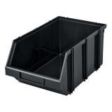 Černý plastový zásobník, stohovatelný. Boční drážky pro sestavení.